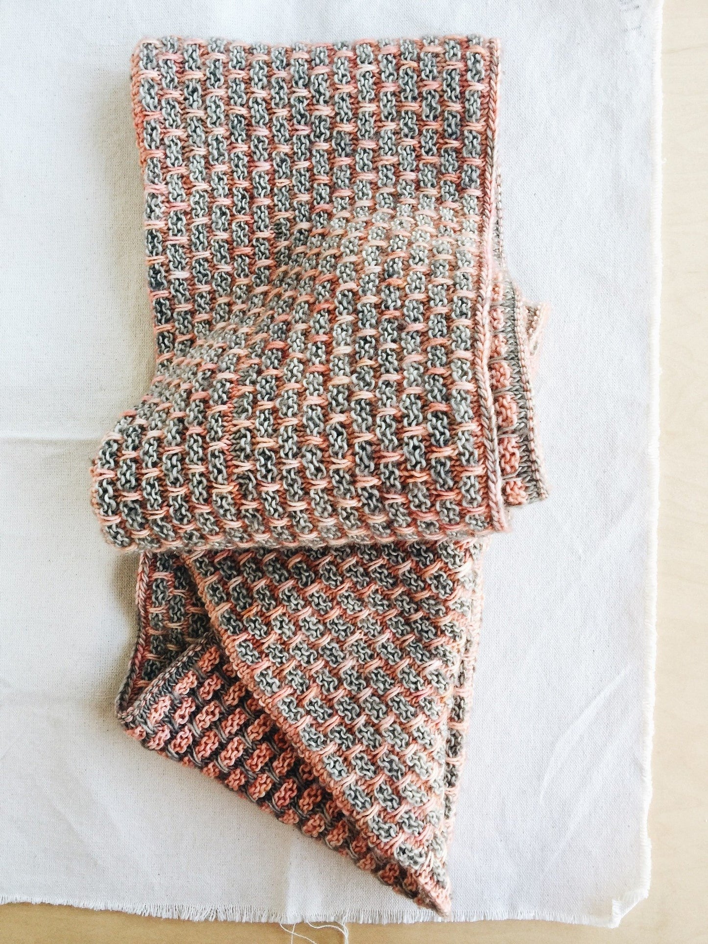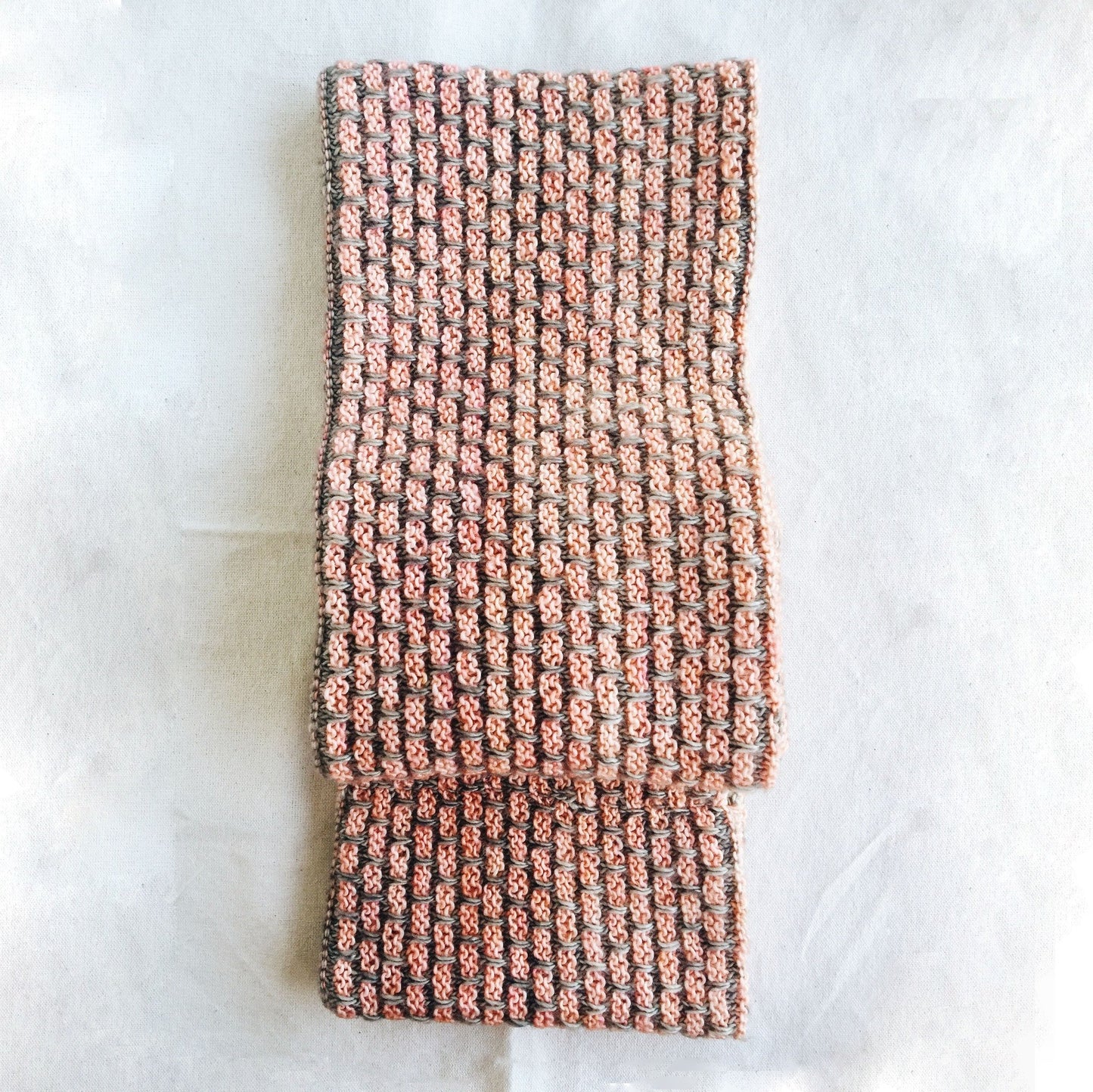 The scarf is worked in the round, starting with a provisional cast on; at the halfway point, the pattern colors are reversed and the second half is worked. The provisional cast on is removed and joined together with the live stitches using a three-needle bind off to create a reversible cowl.
