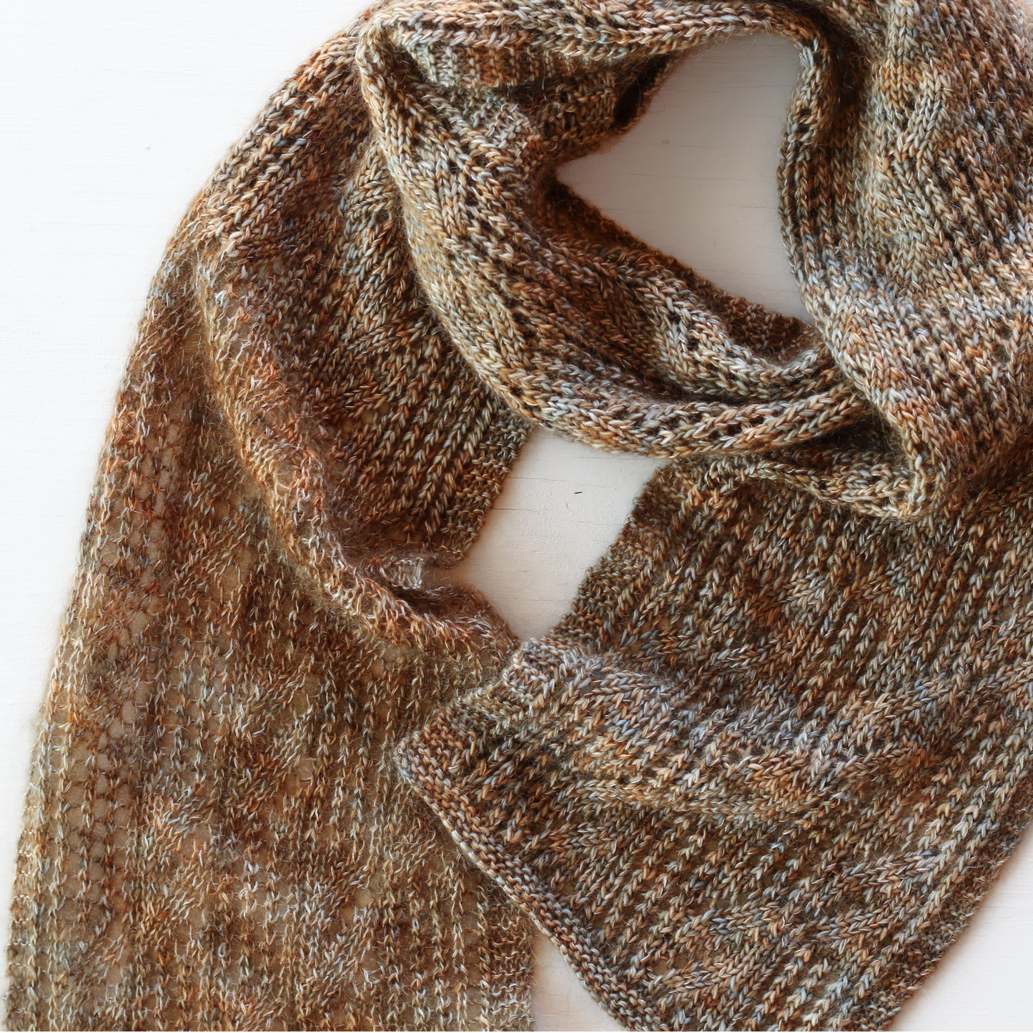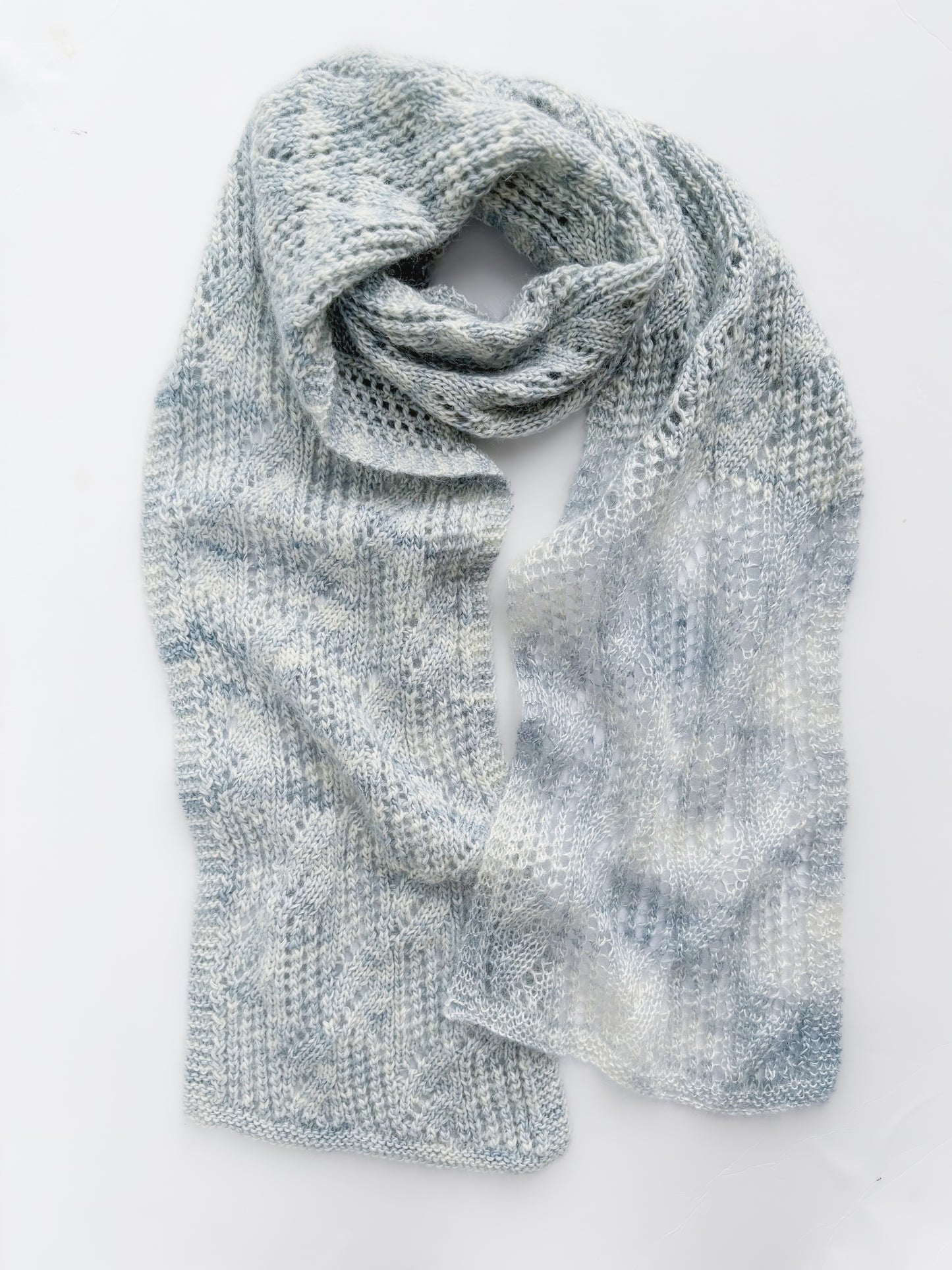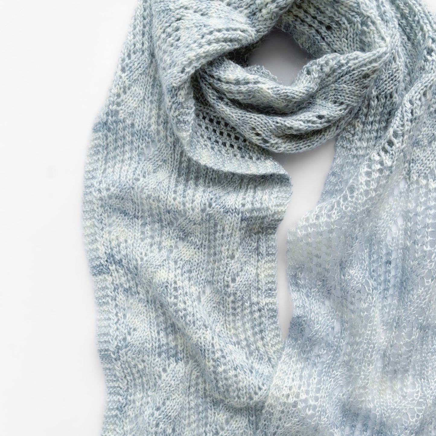 The Fireside Scarf's open lace pattern with the combination of Tosh Merino Light and Tosh Silk Cloud creates a delicate fabric - perfect for all seasons.