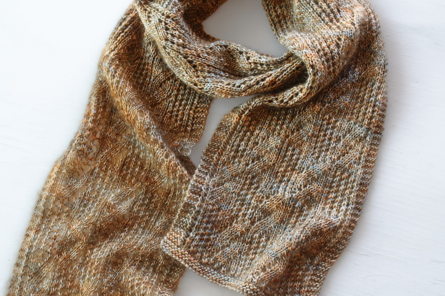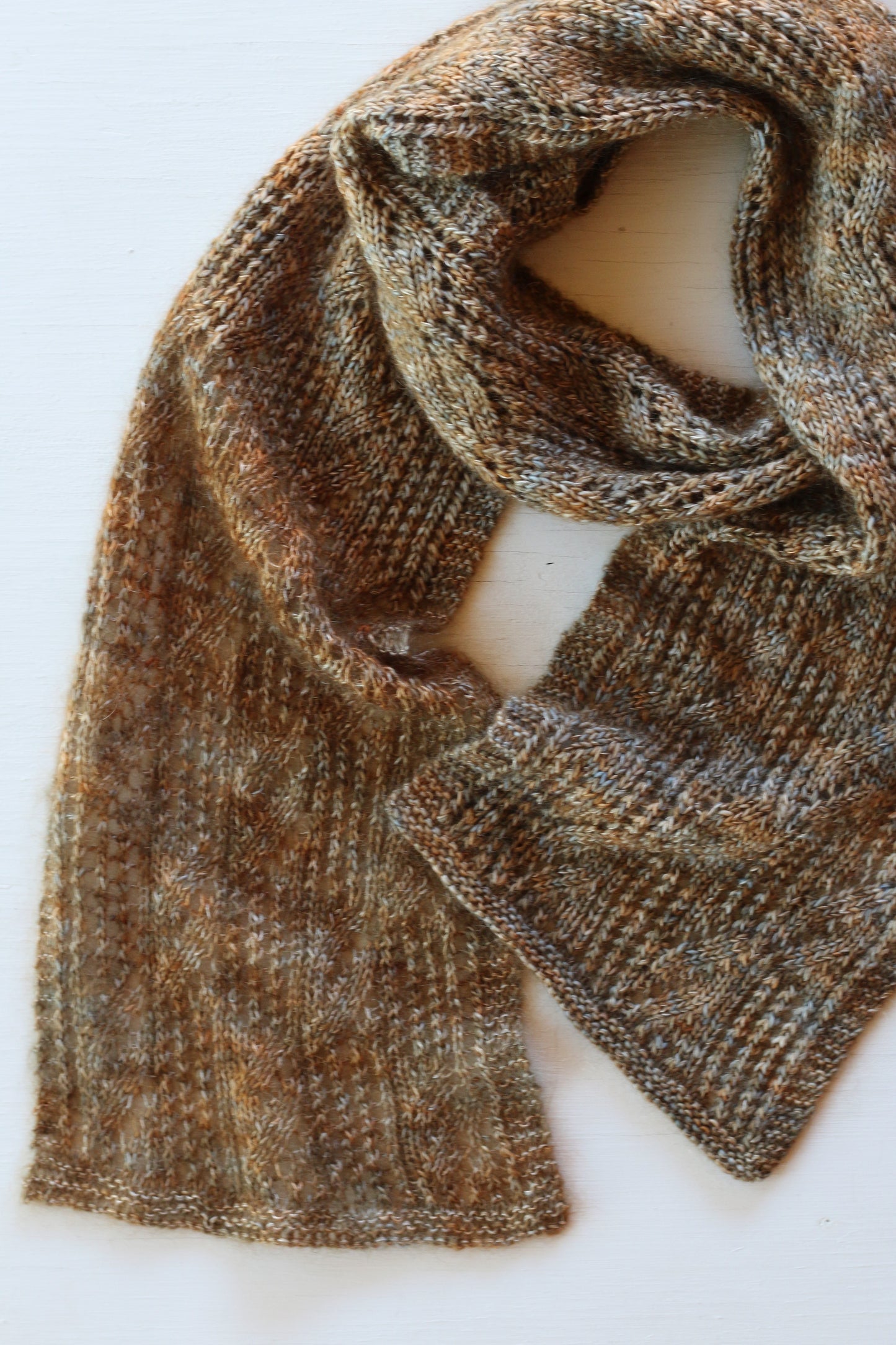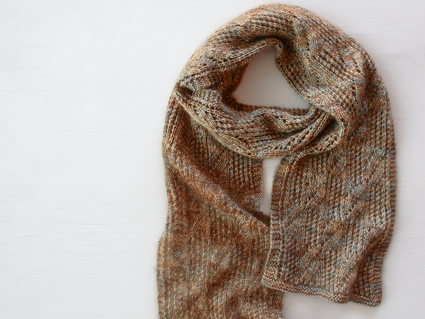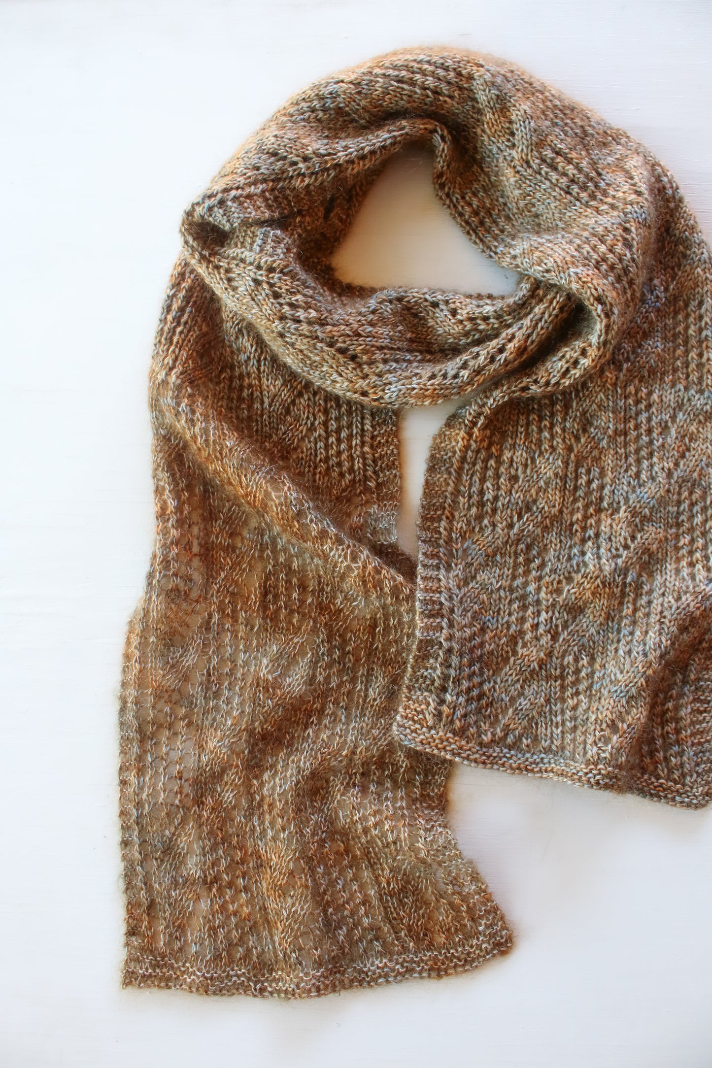 The Fireside Scarf's open lace pattern with the combination of Tosh Merino Light and Tosh Silk Cloud creates a delicate fabric - perfect for all seasons.