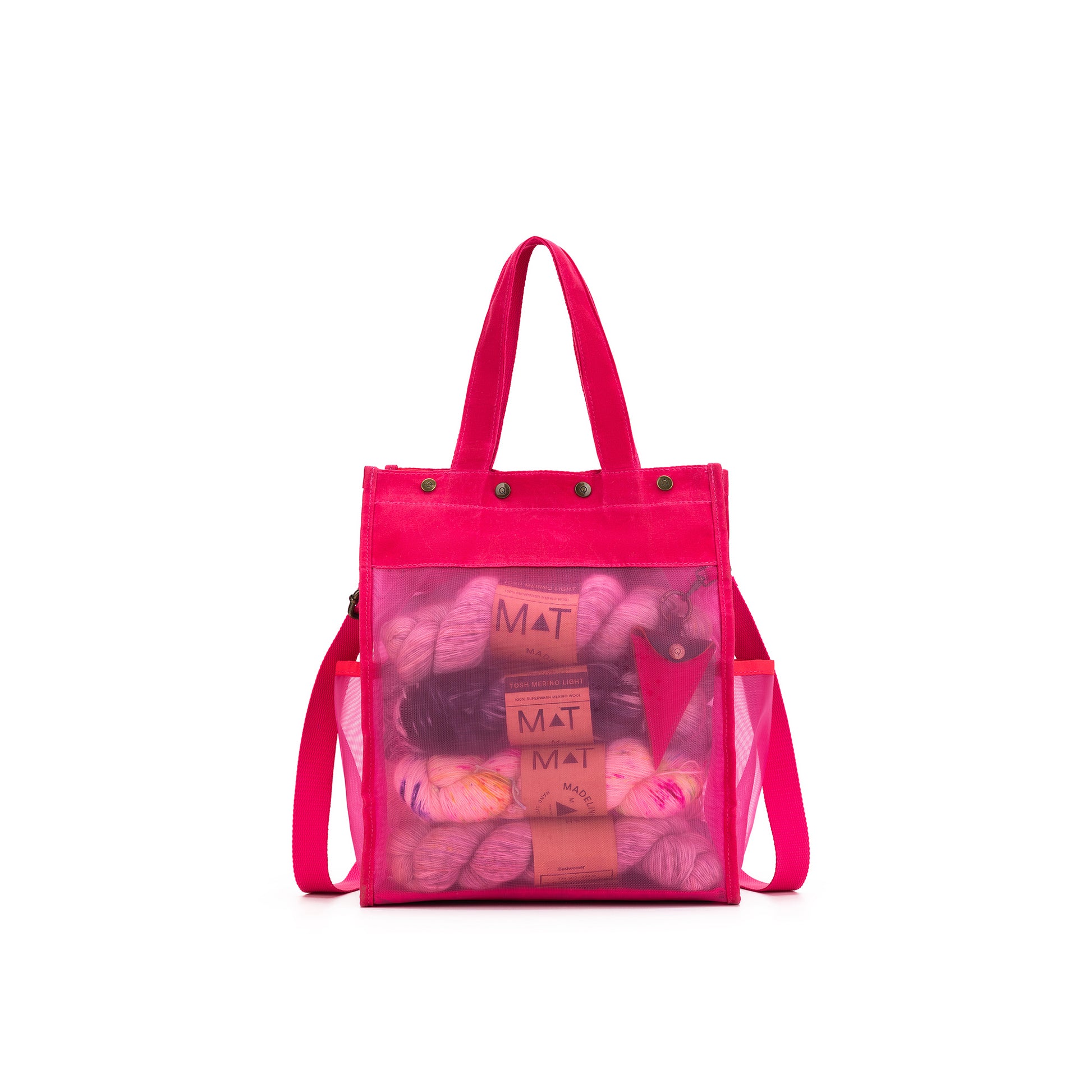 Introducing the della Q Tall Maker's Mesh Tote – a fusion of the tote and a rucksack, perfect for your crafting adventures on warmer days. The Maker's Tall Mesh Tote is the sister bag to the Maker's Mesh Tote, but a bit taller! This fully see-through project bag is designed for practicality and style. Carry it effortlessly as a crossbody or shoulder bag. With ample interior space, it comfortably accommodates over 10 skeins of yarn or medium-to-large-sized projects. Complete with a matching clip-in Scissor Pocket, exclusive canvas Oh Snap, and adjustable strap.