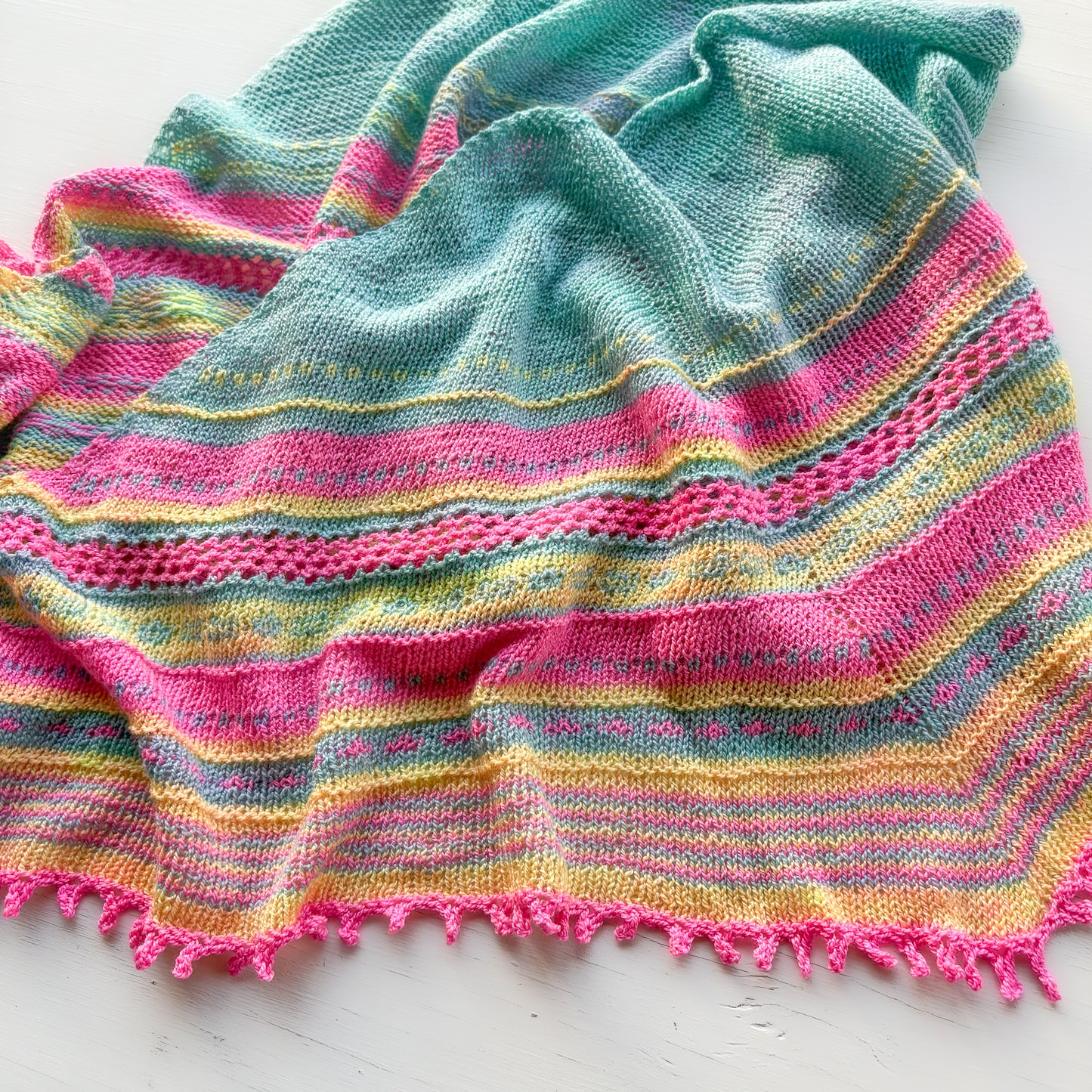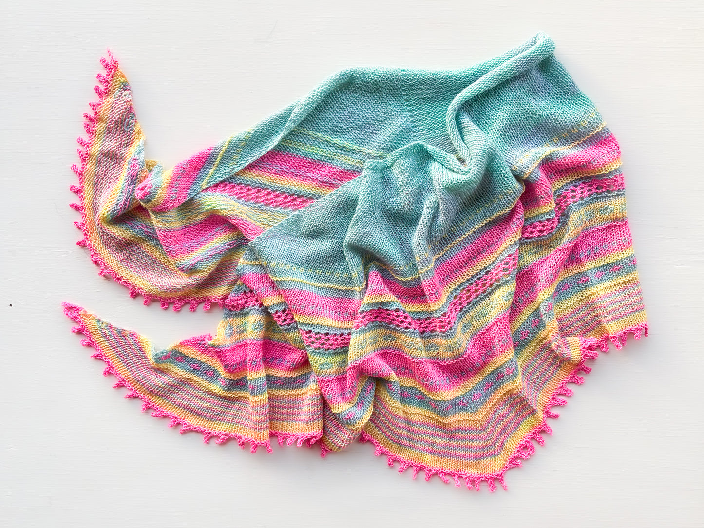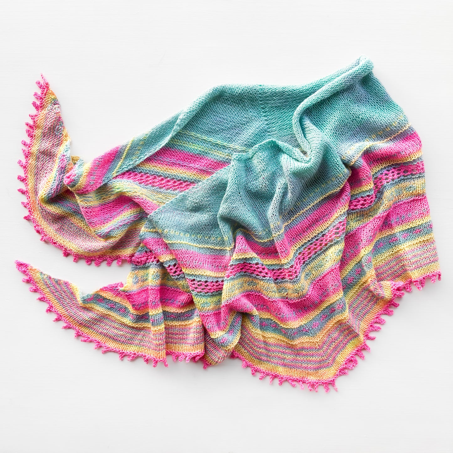 A graphic crescent kissed by a touch of lace. Drapes like a dream and feels like down, knitted above gauge in this Merino/Mulberry fingering weight