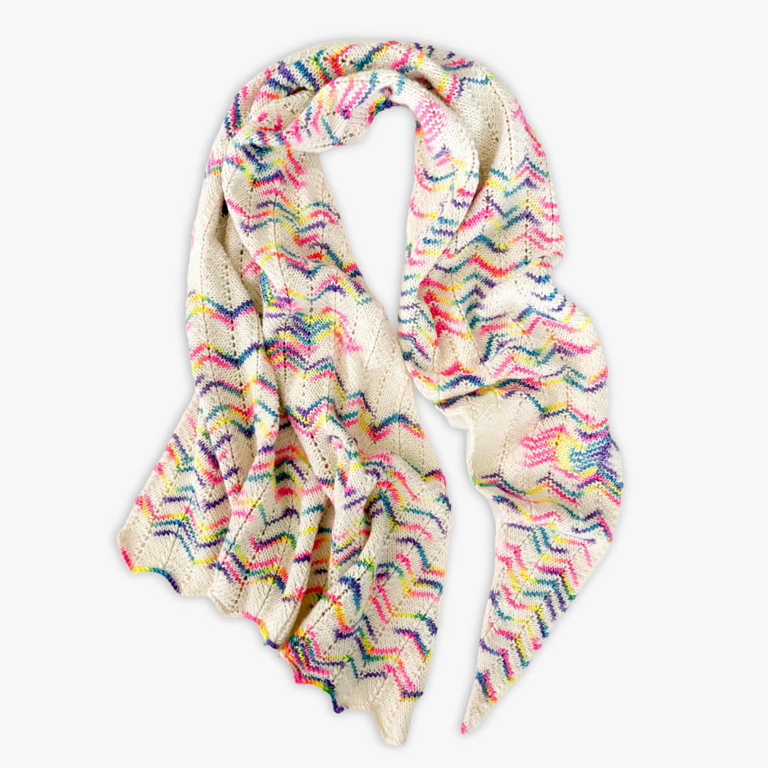Simple chevrons become rainbows when strong accent colors roil through a hand-dyed skein. Let the pooling fall where it may in this sexy, elongated wrap.