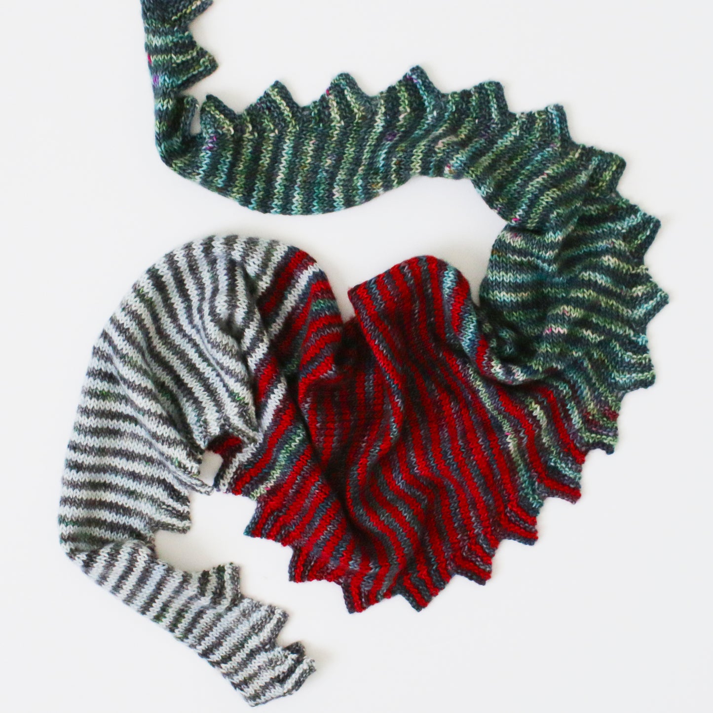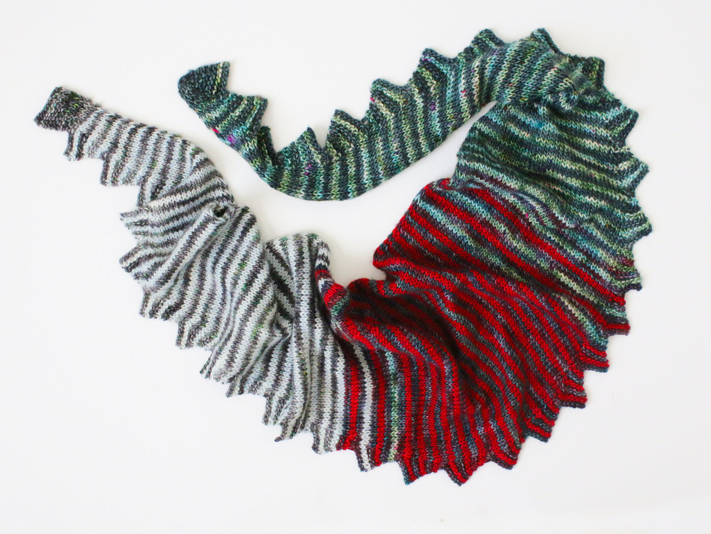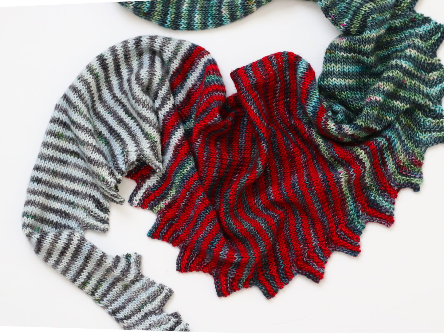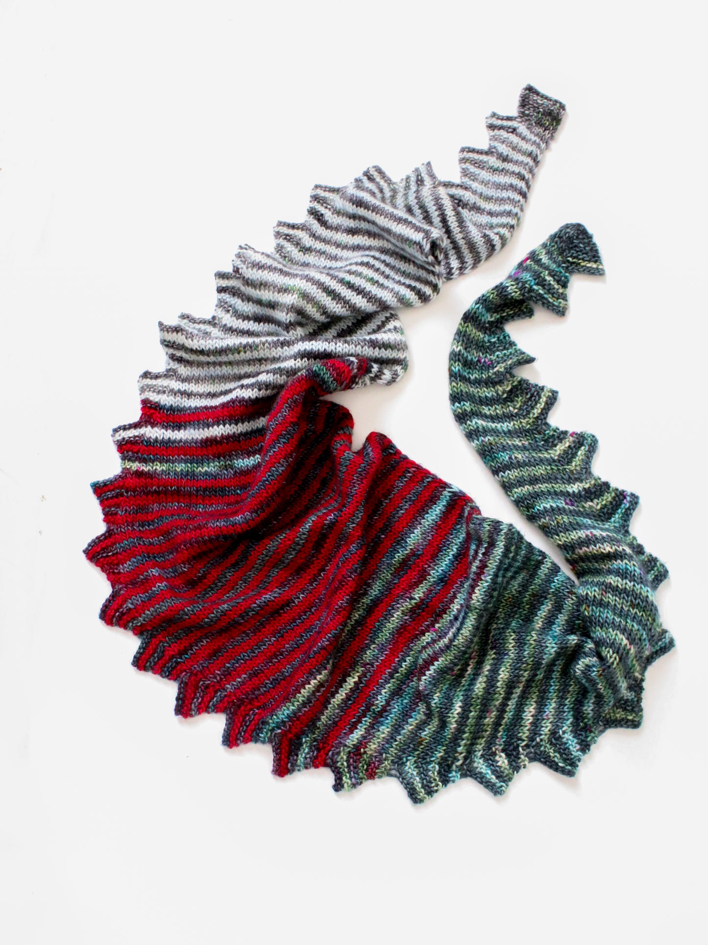 Miniature skeins, graphic stripes, & garter stitch triangle edging deliver big bang impact. Pack this piece for your next trip outside the comfort zone.
