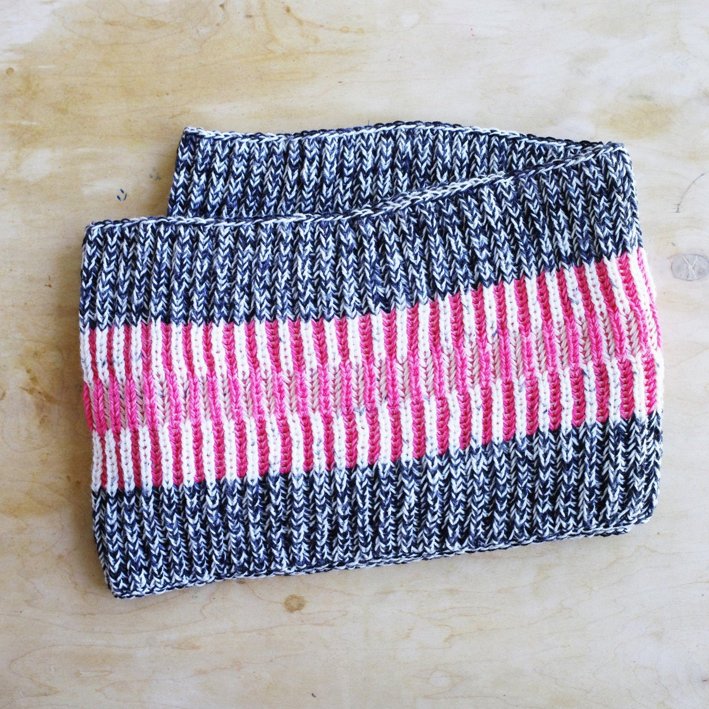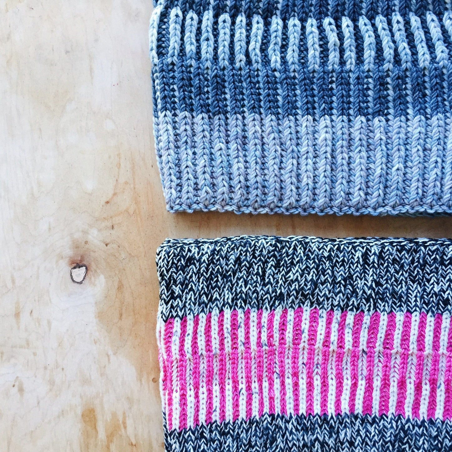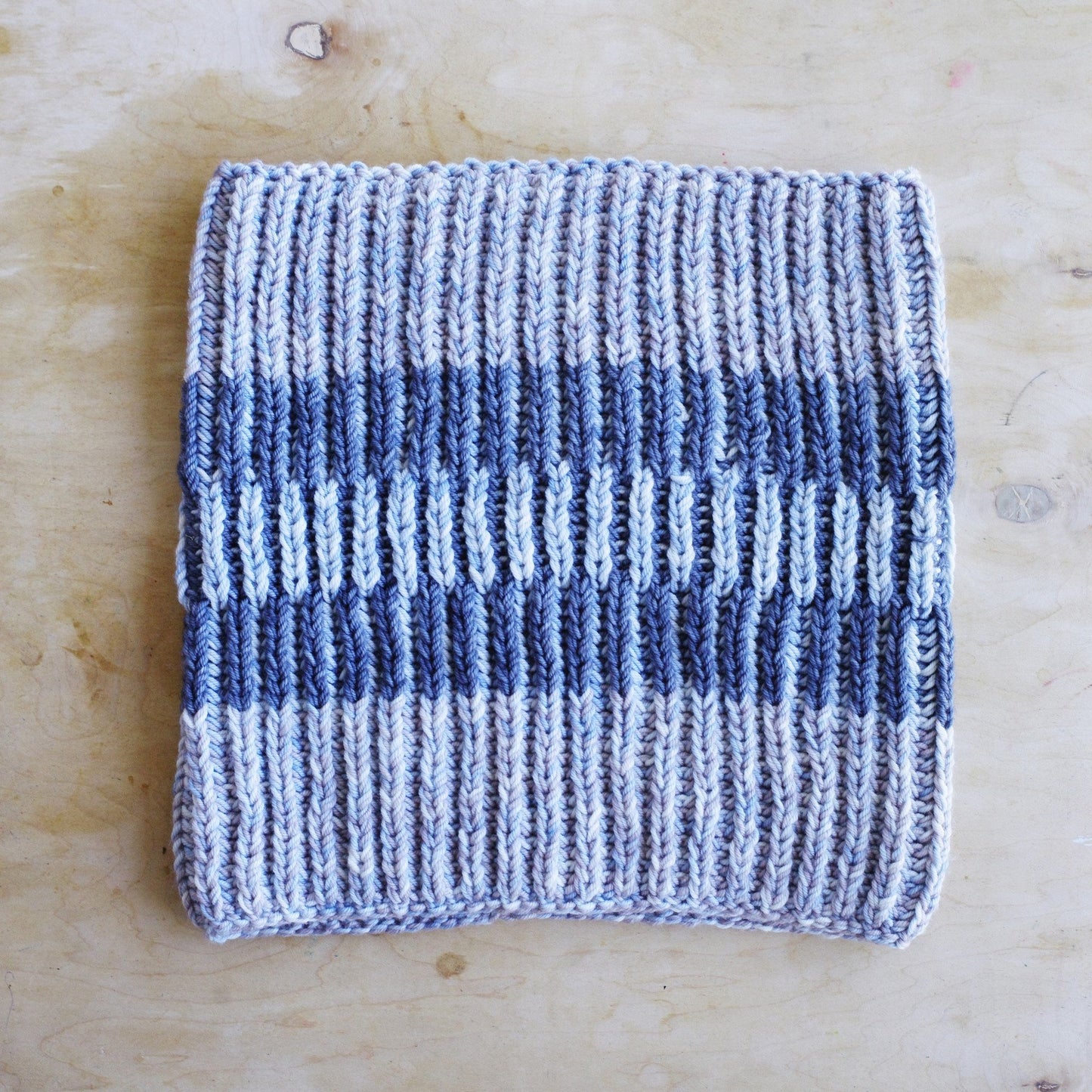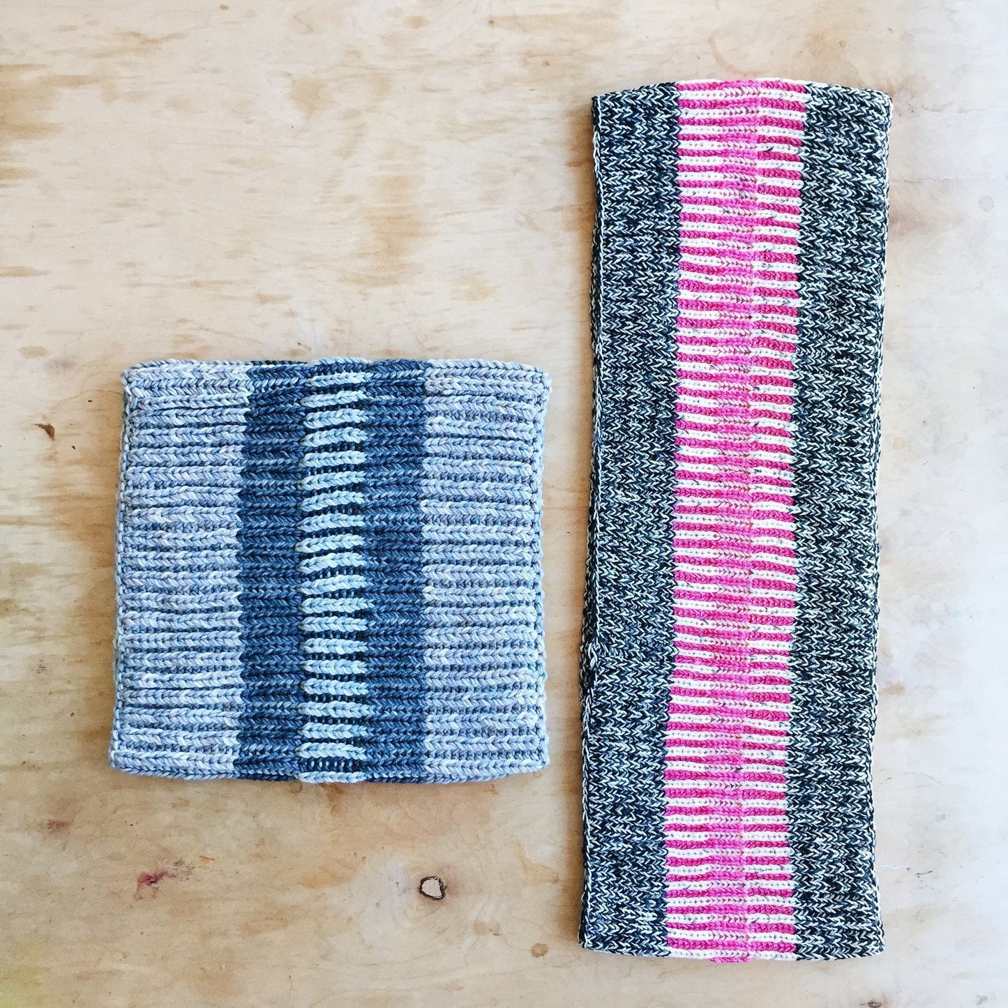 These cowls are all about texture and playing with blending colors. Choose between a single loop cowl knit using two strands of DK together for a bulky yarn, or a double loop cowl, knit out of 2 strands of fingering weight yarn held together. With a panel of syncopated brioche in the middle, this cowl is as fun to knit as it is to wear, and perfect for both men and women.